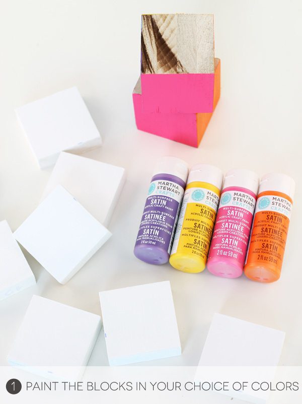 I painted each of the flat blocks with white paint. Then, I painted each face of the cube in a bold color. You can get creative here …or you can just use the wood as is!