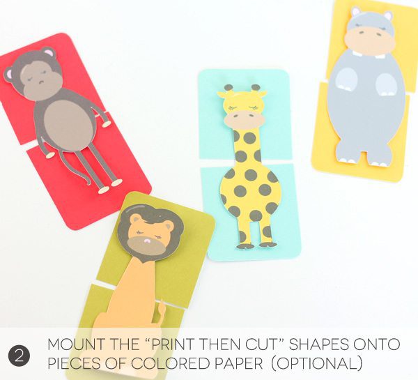 The next step is totally optional. I wanted to add a little more color to the project, so I cut rectangles of colored paper in half. Then I cut each animal in half (not shown) and adhered the animal to the colored paper with glue.