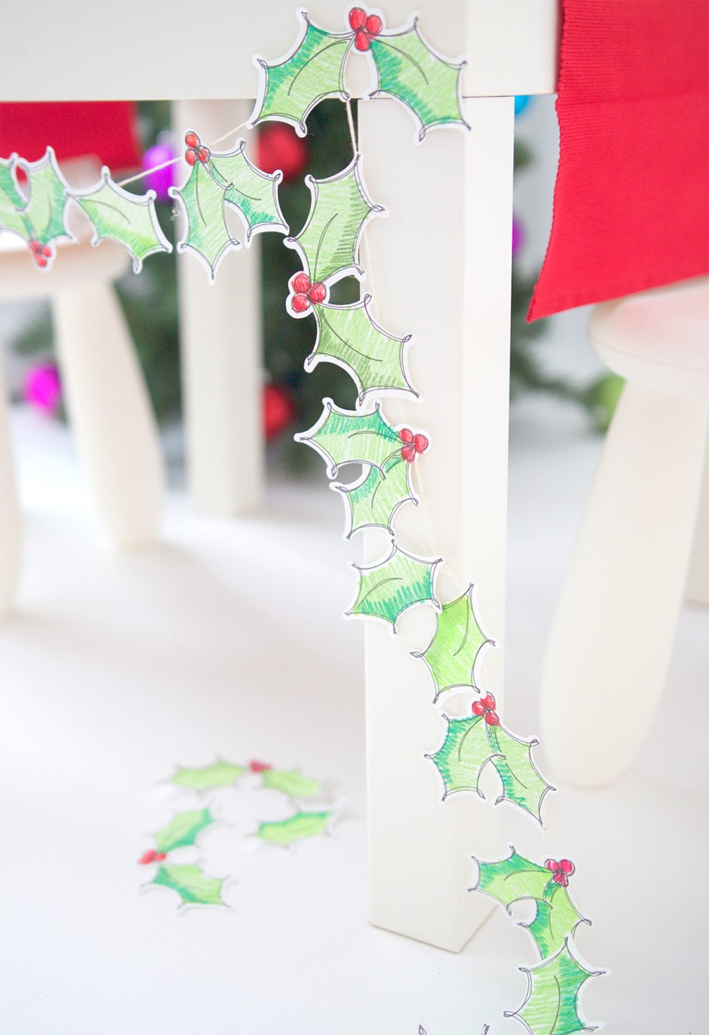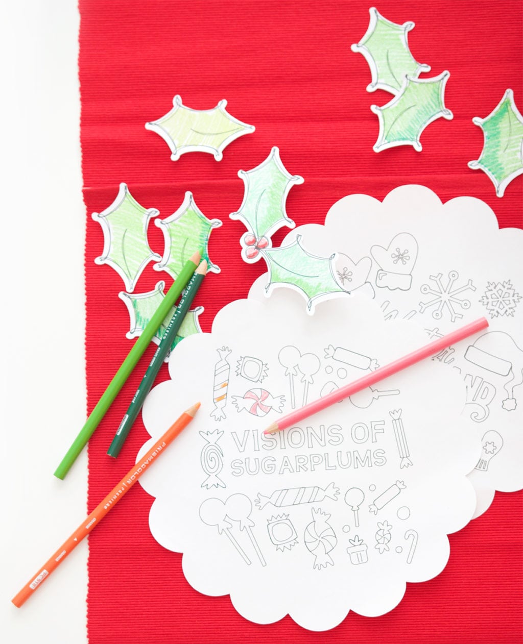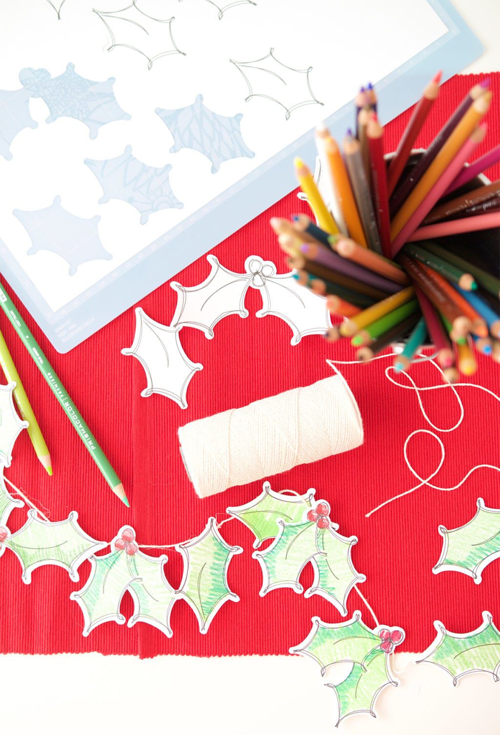 I used the Explore to create several coloring pages and shapes, then broke out my well loved Prismacolor pencils to bring everything to life. There are a ton of shades, which means plenty of options for creating the perfect dimension on my holly leaves…and as you can see…your coloring doesn’t even have to be neat! I actually think the messy scribbles make it fun. When they were all colored, I just glued them onto a piece of twine and made a simple, handmade holly garland.