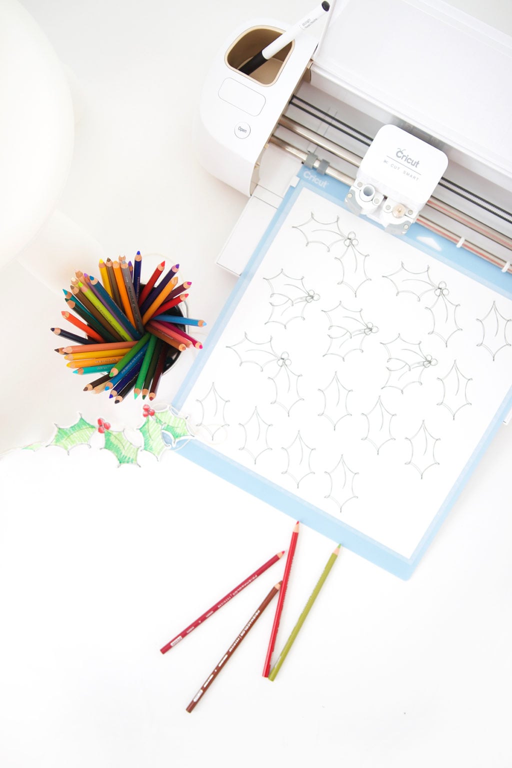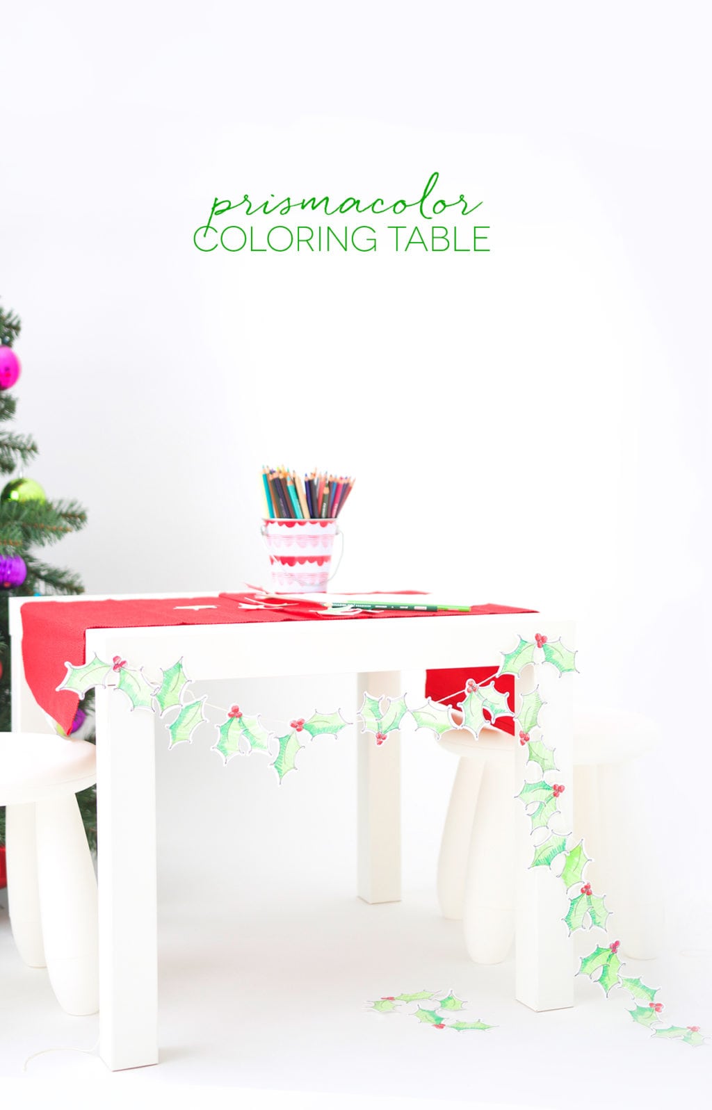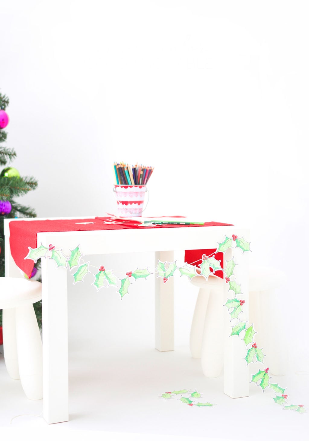 I used the Explore to create several coloring pages and shapes, then broke out my well loved Prismacolor pencils to bring everything to life. There are a ton of shades, which means plenty of options for creating the perfect dimension on my holly leaves…and as you can see…your coloring doesn’t even have to be neat! I actually think the messy scribbles make it fun. When they were all colored, I just glued them onto a piece of twine and made a simple, handmade holly garland.