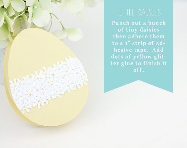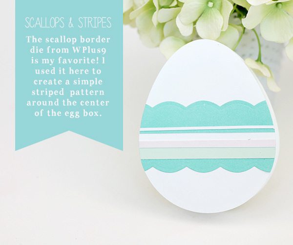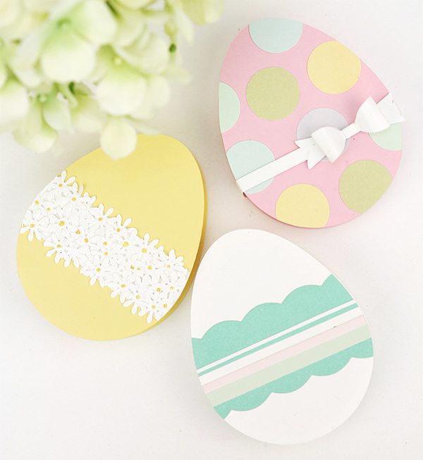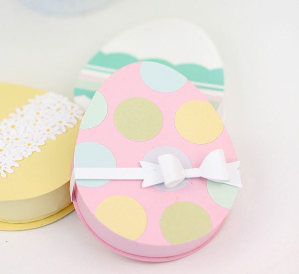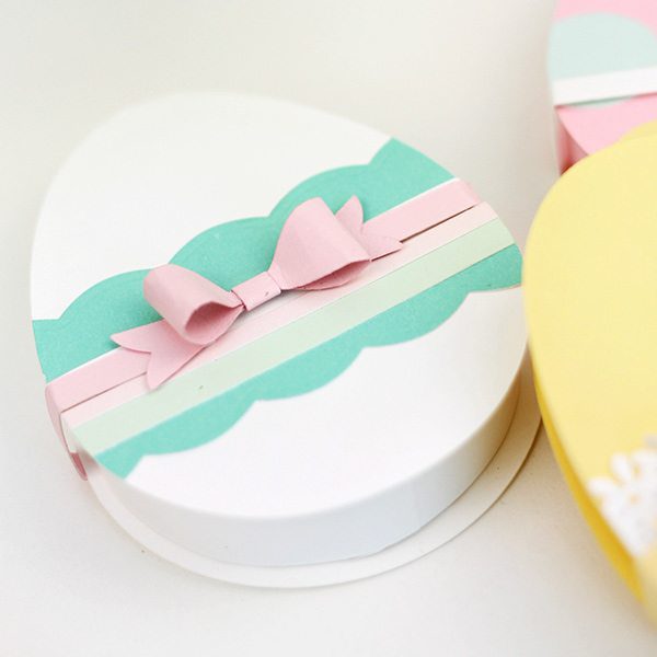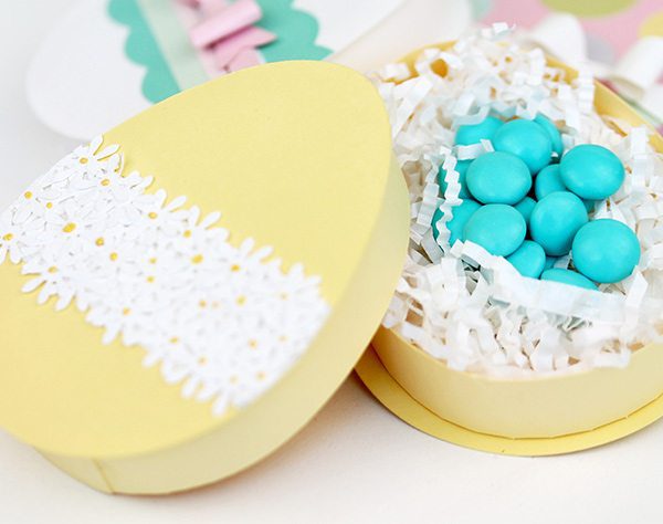 For my egg boxes, I used my Cricut Explore to cut out 3″ wide egg shapes, but you can totally cut them out with scissors. Once the box is assembled, have fun decorating the top with spring-timey patterns and colors.