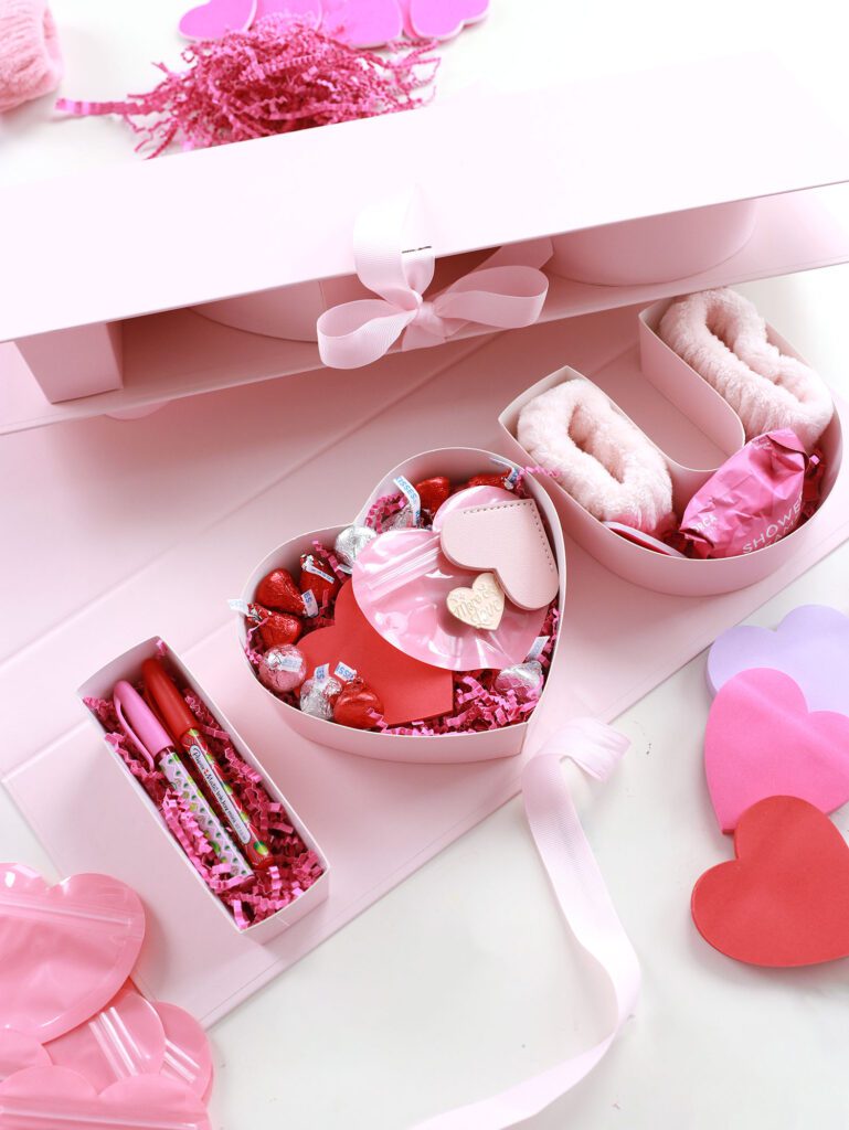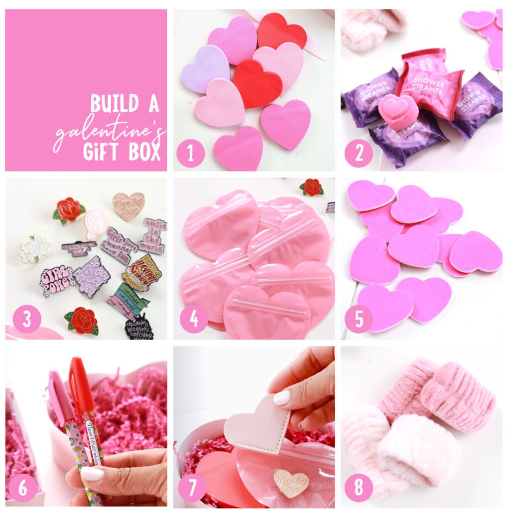 The next step is filling up your gift box with Galentine’s Day goodies. The name of the game is “heart shaped” everything!! Here’s your checklist: