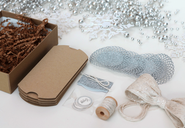 TomKat Silver Glimmer Twine | Paper Source Glitter Wrapping Paper in Silver | A2 Kraft Invitation Box | Kraft Cardstock | Lifestyle Crafts Pillow Box Die | Papertrey Ink Doily Details Die Collection | Papertrey Ink Parisian Die | We Love Citrus Twine Mini Spool | Clear & Simple Stamps Topper Die