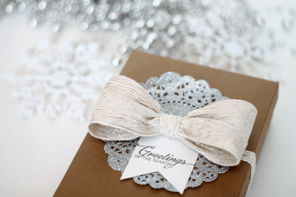 This is a gorgeous way to wrap. I adore the doilies and glitter twine. Thanks for sharing.