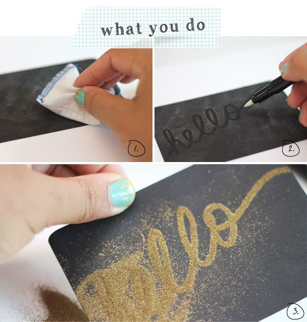 {3} Pour embossing powder on to card, covering your handwriting. Then shake off excess.
