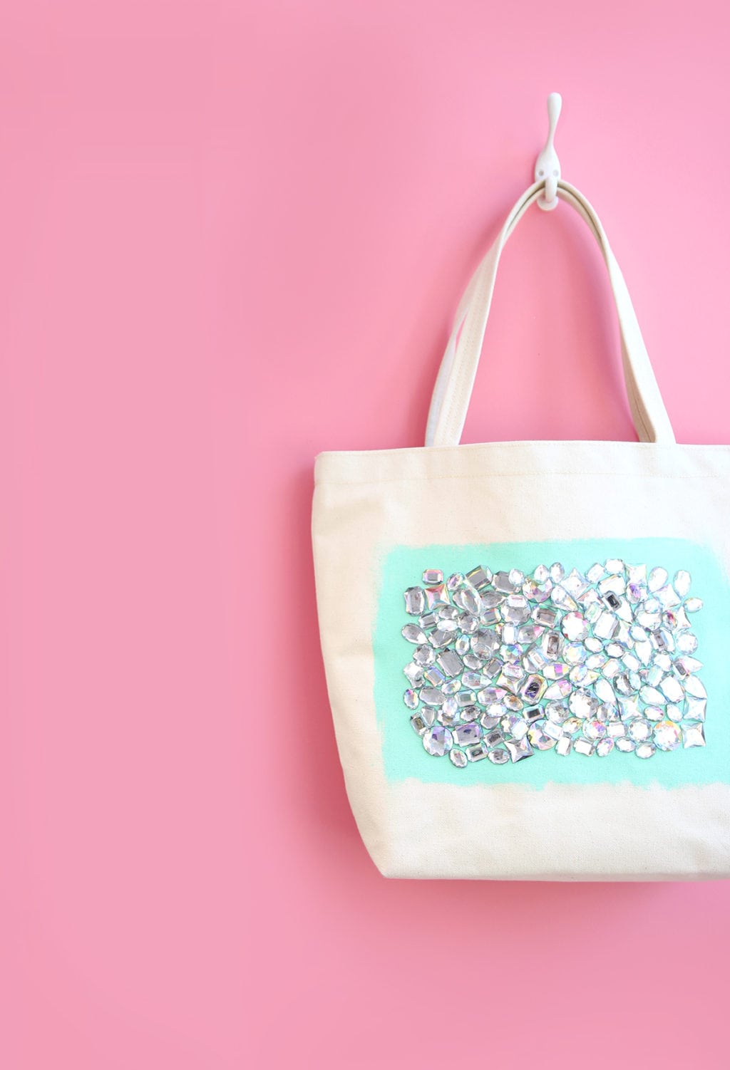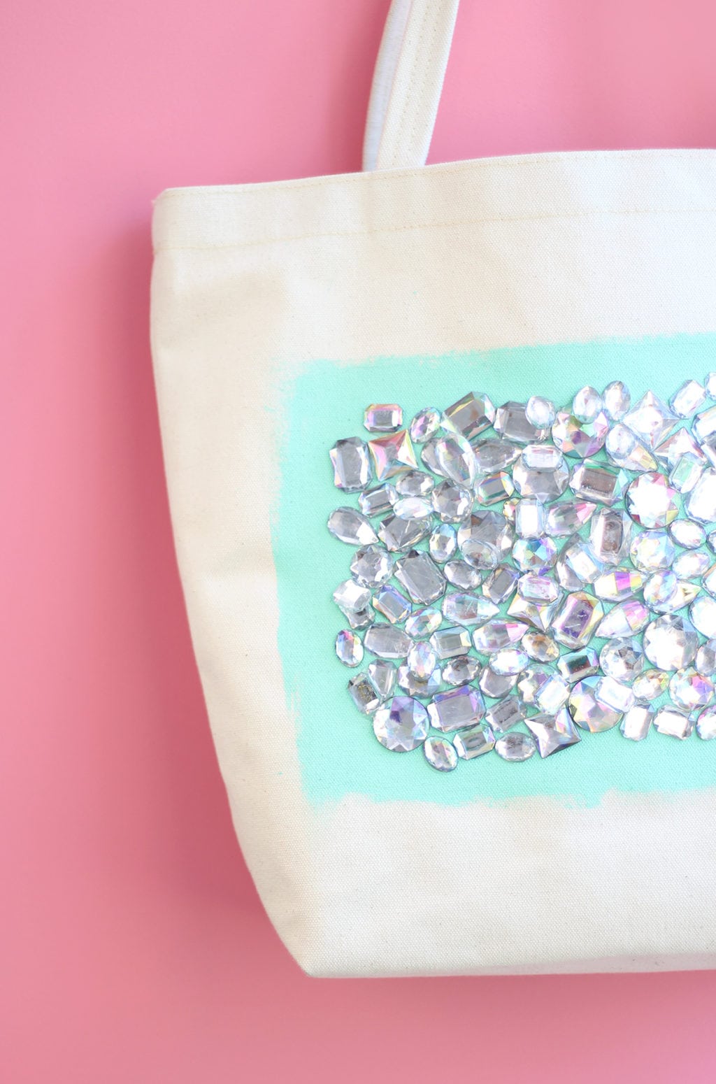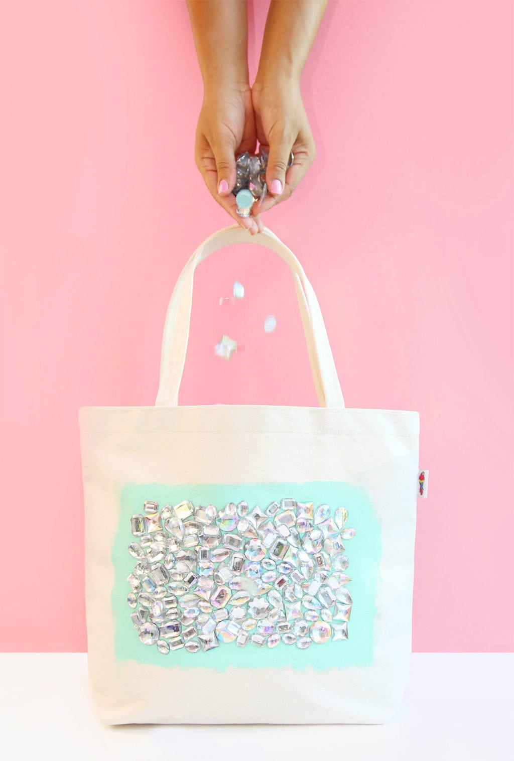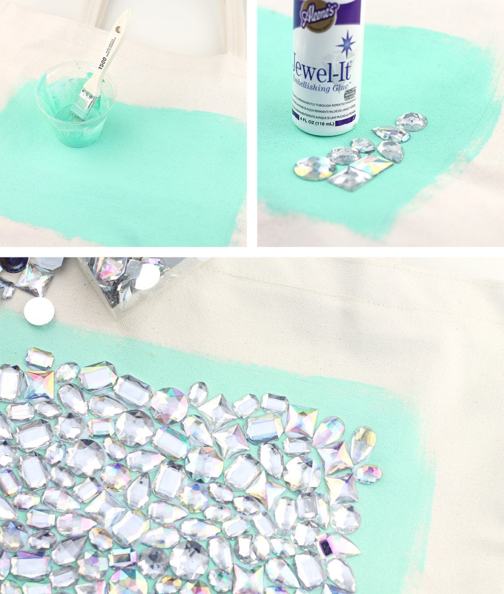 - Apply dots of glue directly onto the fabric tote and place rhinestones on top.