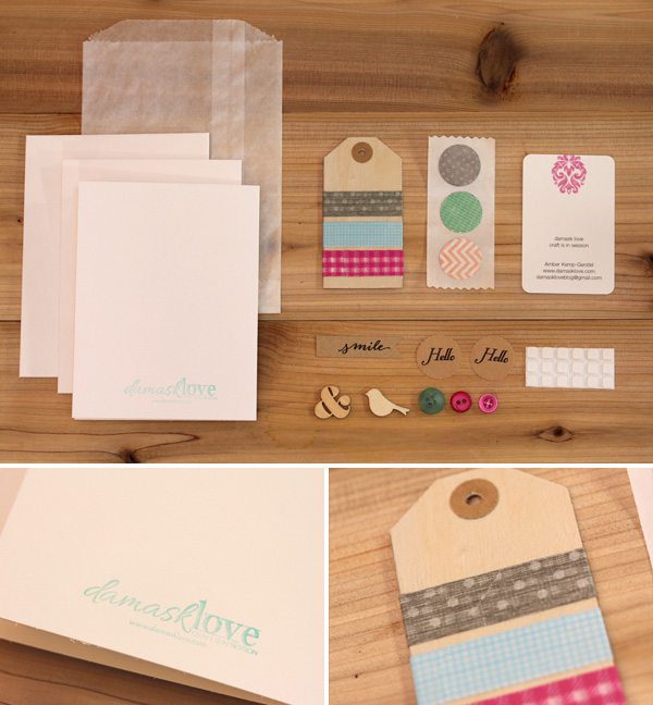 For my business card, I wanted to create something handmade that spoke to the Damask Love brand. Damask Love is all about creating with paper and encouraging others to get creative with cardstock. Soooo…what better way to share the Damask Love brand, than to create simple kits of crafting supplies!