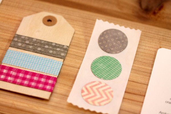 {WOODEN WASHI TAGS} I cut 100 wooden tags from a piece of thin birch and then wrapped washi around each tag. I chose colors that stayed true to the Damask Love brand but also offered variety and fun.