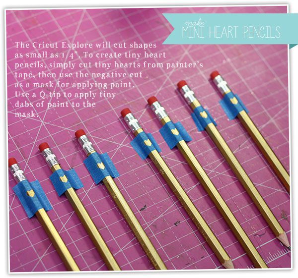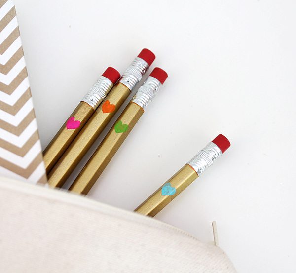 With my cute, monogrammed bag all done, I filled it with some equally cute pencils. I spray painted them gold and then used the Explore one more time to add teeny, tiny hearts to each one.