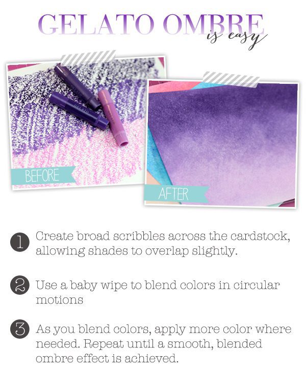 Ever since I got my package of gelatos, I’ve been addicted to the beautiful ombre effect you can create with them. I’ve created ombre stationery with them and today I’m creating on a bigger scale by using 11×17 Natural White Cardstock from Paper Presentation. This particular cardstock is thick and has a bit of texture to it, both of which work well for blending the colors together with a baby wipe.