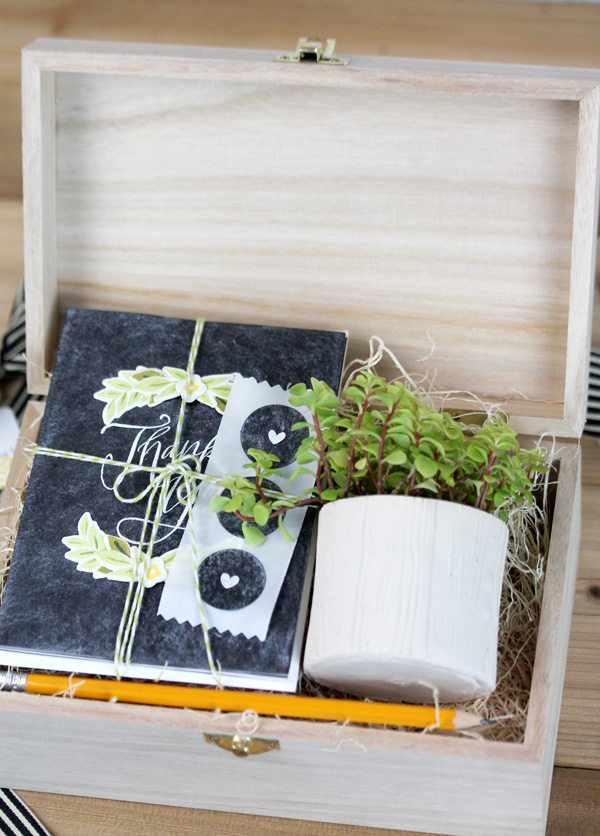 For some reason, succulents and chalkboard were a natural combination for me, so I created a coordinating set of chalkboard stationery and boxed everything up in a pretty wood gift box.
