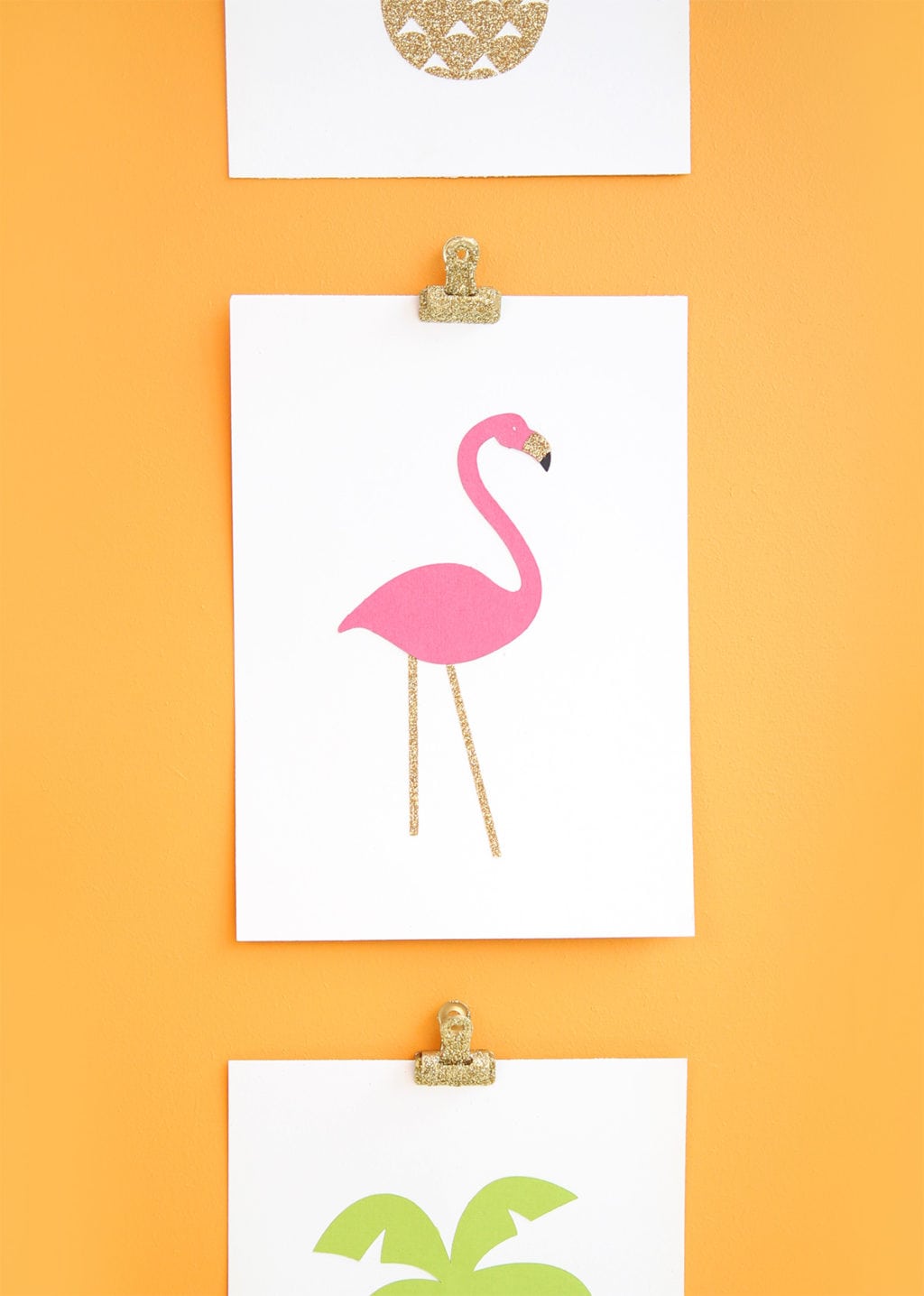 I sort of wish I could have a pet flamingo, but there is probably some sort of law against that. I don’t think you can walk them on a leash or feed them from a water bowl. There’s no law against papercrafted flamingos though, so that’s what I’m doing. I’m making a trio of wall prints featuring a bright pink flamingo…with gold glitter legs. Because if I ever manage to get a pet flamingo, it will most certainly have gold glitter legs. And I’ll name him Liberace.