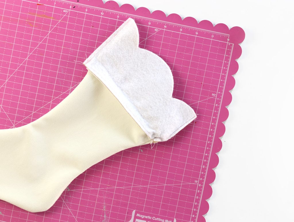 Once the velvet stocking portion is sewn together, turn the stocking inside out. At this stage, the pretty velvet will be on the outside and the wrong side of the glitter felt will be face up.