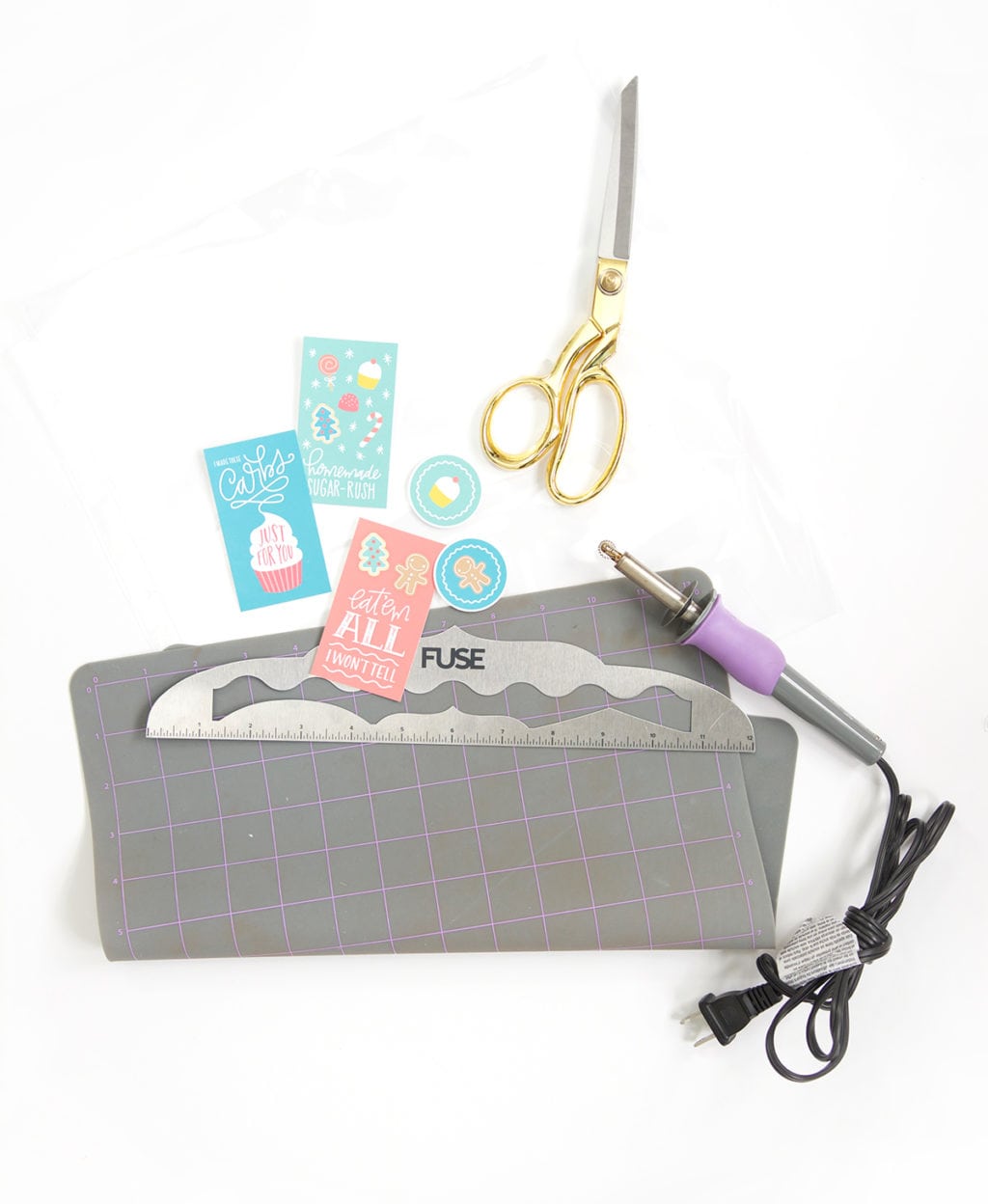 - the We R Memory Keepers Fiskars Tool. It’s a tool that heats up and basically creates permanets welds in plastic sheets, so you can use it to create customized pockets on scrapbook page layouts. That is, of course, unless you’re me. If you’re me, then you use the Fuse to weld those plastic sheets into perfect little packages filled with Christmas cookies.