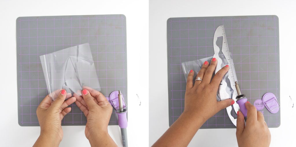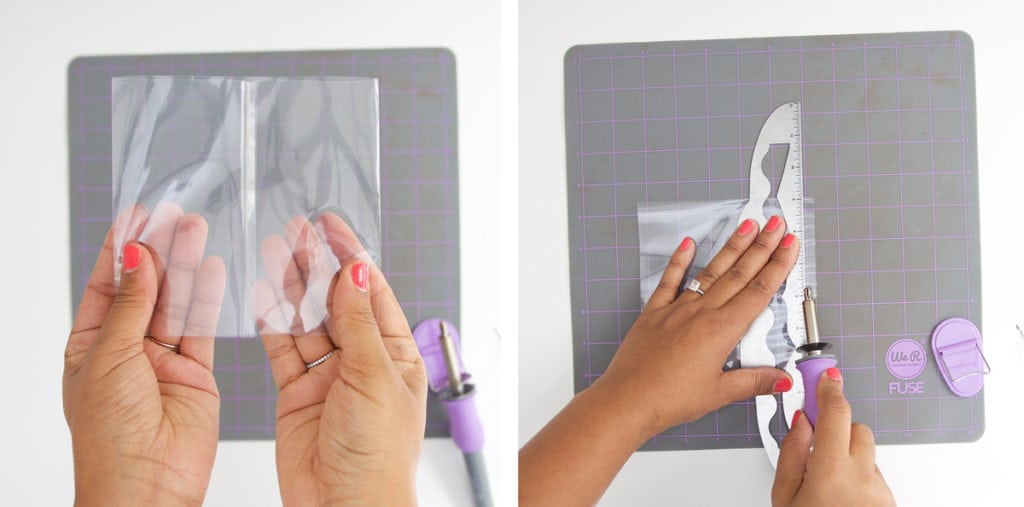 - Cut the plastic sheet to create one flat piece of plastic. Fold it in half then use the ruler and heated fuse tool to seal the open edge.