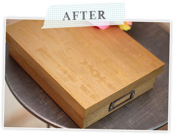 I’m mildly obsessed with the woodgrain tool so used it to add texture to the top of the file box. To achieve the woodgrain look, apply your first coat of metallic paint, then allow it to dry completely. Go over with a second, liberal application of the same color then drag the woodgrain tool through the wet paint. For the table, I used the same technique, but chose the linen tool to add the feeling of textured fabric.