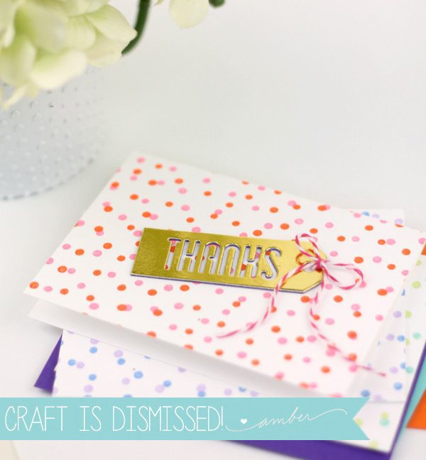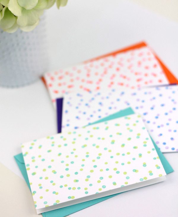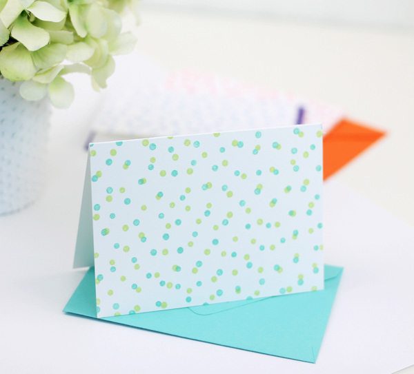 I’m a big fan of simple stationery that is easy to mass produce and these certainly fit the bill. The random polka-dot pattern of the Confetti Background stamp allows you to layer different ink color resulting in a little confetti party on your paper.