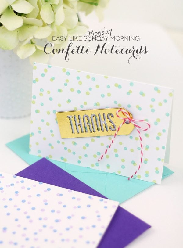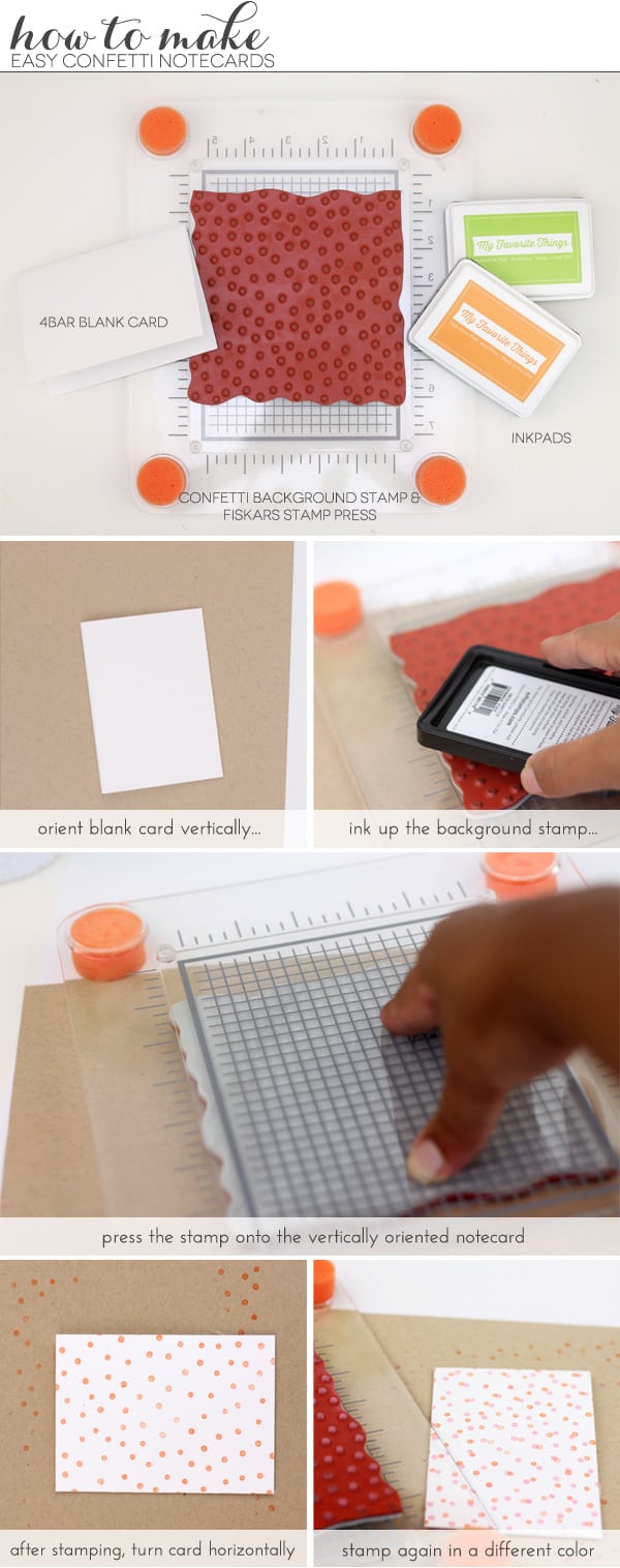 The look of falling confetti is super popular in stationery design, but it can be a little bit of a pain in the tochus to create. I’ve seen people use hole punch scraps, pencil erasers and daubers to get the confetti effect. While all of those work just fine, none are as quick and easy as this approach which uses the soon to be released Confetti Background stamp from My Favorite Things. In today’s special Monday edition of Easy Like Sunday Morning, I’ll show you how to use this stamp to make cute, simple cards that are perfect for gift giving or for last minute notecards.