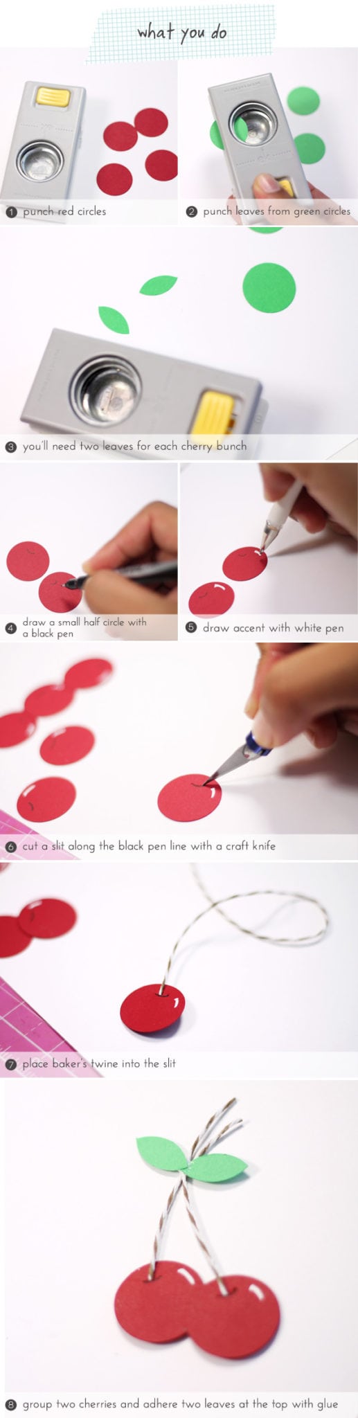 Sadly, cherry season will end leaving me high and dry and forced to move on to the next craving. French fries are a strong contender. When that happens, I’ll have this cute paper project to remind me of my cherry-loving days. Here’s how they’re made:
