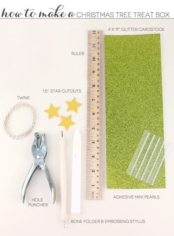 You probably have most of these supplies on hand or can get them without too much trouble. I love the way this project comes together with the glittery green cardstock, but you certainly could create the same treat boxes with plain cardstock.