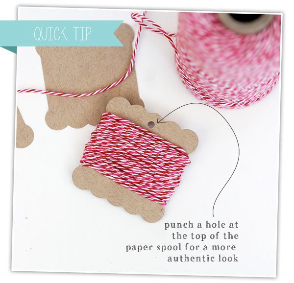 Baker’s twine is my go to for finishing off pretty little packages. Thanks to this post, my baker’s twine corner is relatively organized – but from time to time I like to package up smaller spools to give away to friends or include in a crafting kit, like the one of page 23 of the Toile Valentine’s Day issue.