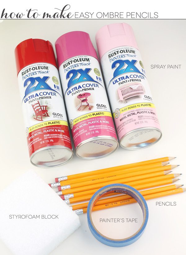 Easy Ombre Valentine Pencils | damask loveChances are you have most if not all of these supplies lying around the casa. I particulartly love Rustoleum 2x Painter’s Touch spray paint because you only need one coat. It’s quick and easy. It also comes in a ton of colors so creating this ombre collection was easy to do.