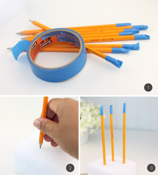 3. With about 1″ of the pencil in the styrofoam, the pencils will now stand on their own making it easy for you to spray paint them and allow them to dry completely. Easy! Almost too easy.