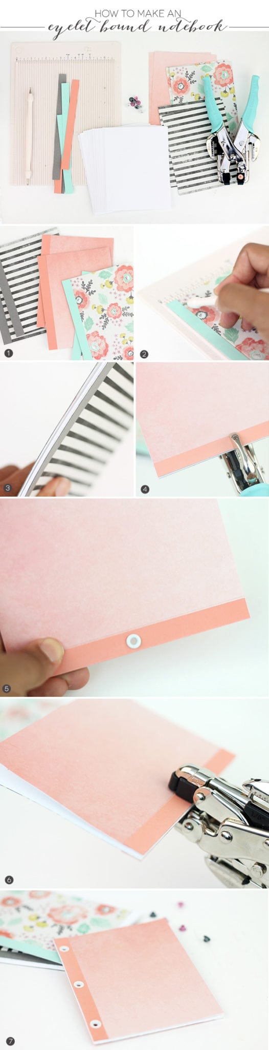 {7} Punch holes on the top and bottom of notebook edge and secure with eyelets