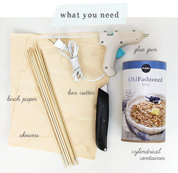 {2} Trim wood paper into 1/2″ strips and trim the skewers to approximately 1″ taller than the height of the cut oatmeal box.