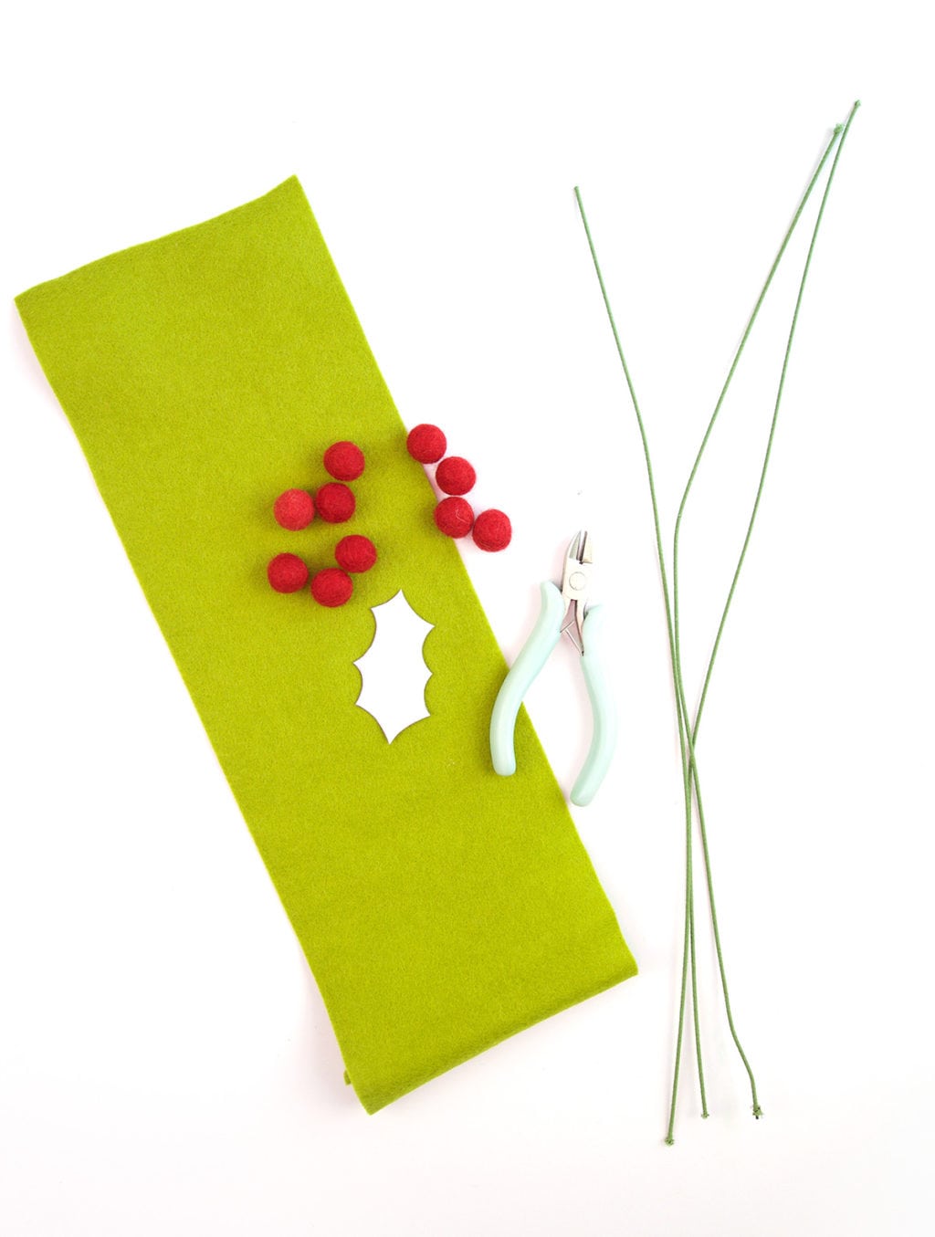 Thread both felt balls onto either end of the floral wire. Next, trace four of the holly leaf shapes onto the felt.