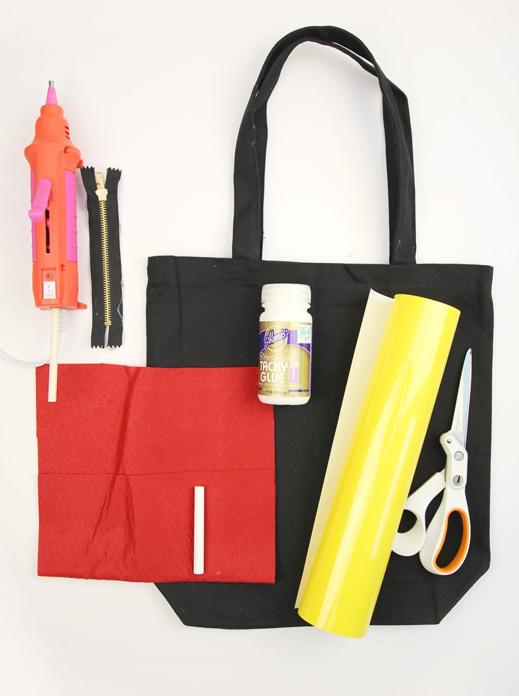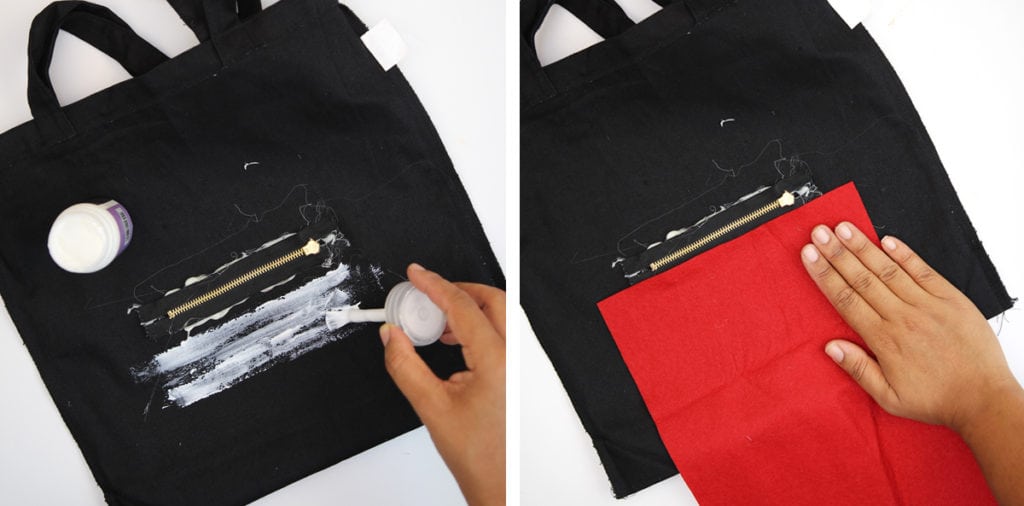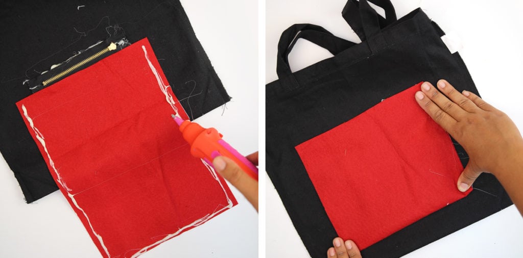 - Apply hot glue as shown and fold the felt so that the top edge of the felt is above the zipper. This will create a pocket on the front of your tote.