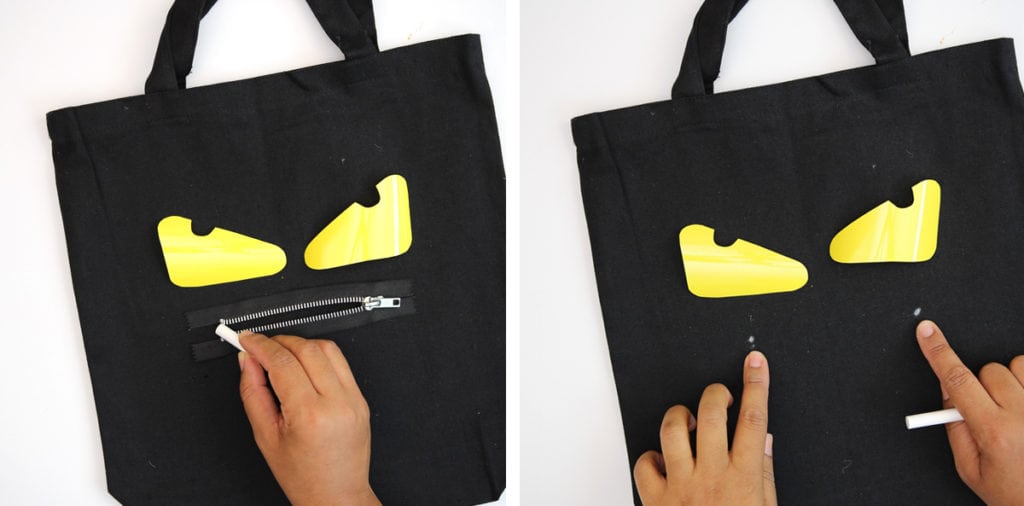 - Unzip the zipper and place it onto the tote. Use a piece of chalk to draw a dot on each end of the zipper teeth