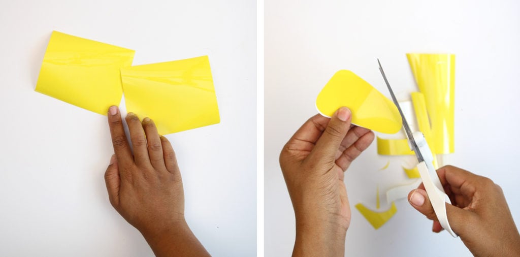 - Cut two pieces of iron on vinyl, then with the white sides facing each other, cut out the eye shapes for your monster.