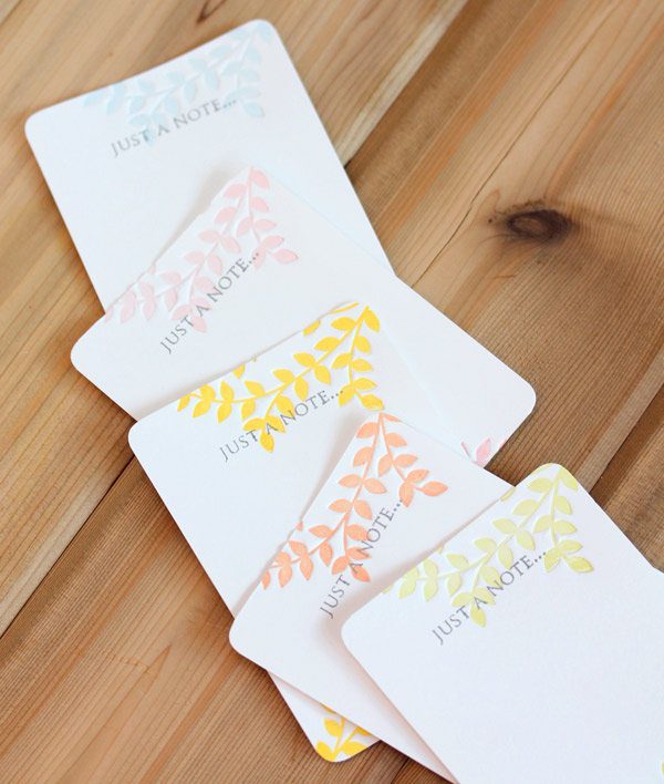 Of all the sets available, the leaf impression plate is my fave! It’s perfectly my style and I found tons of uses for it. On this card, I letterpressed the top and bottom of a 4bar notecard to create this set of springtime stationery. By letting the design hang off the edge of the paper, I achieved a partial impression of the image.