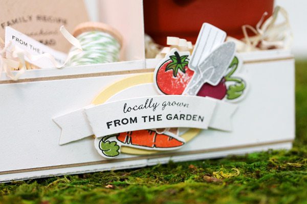 On the left side of the treat container, I created little recipe cards and envelopes using the Mini Pocket Die – another one of my faves. I also included some tags using the banner die from the Tape It Kit. On the right, I placed a mini terracotta pot, filled with some fresh basil.