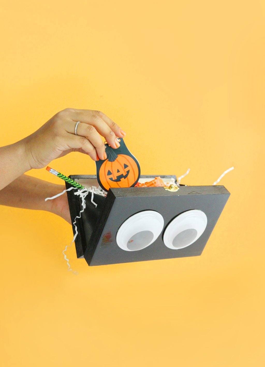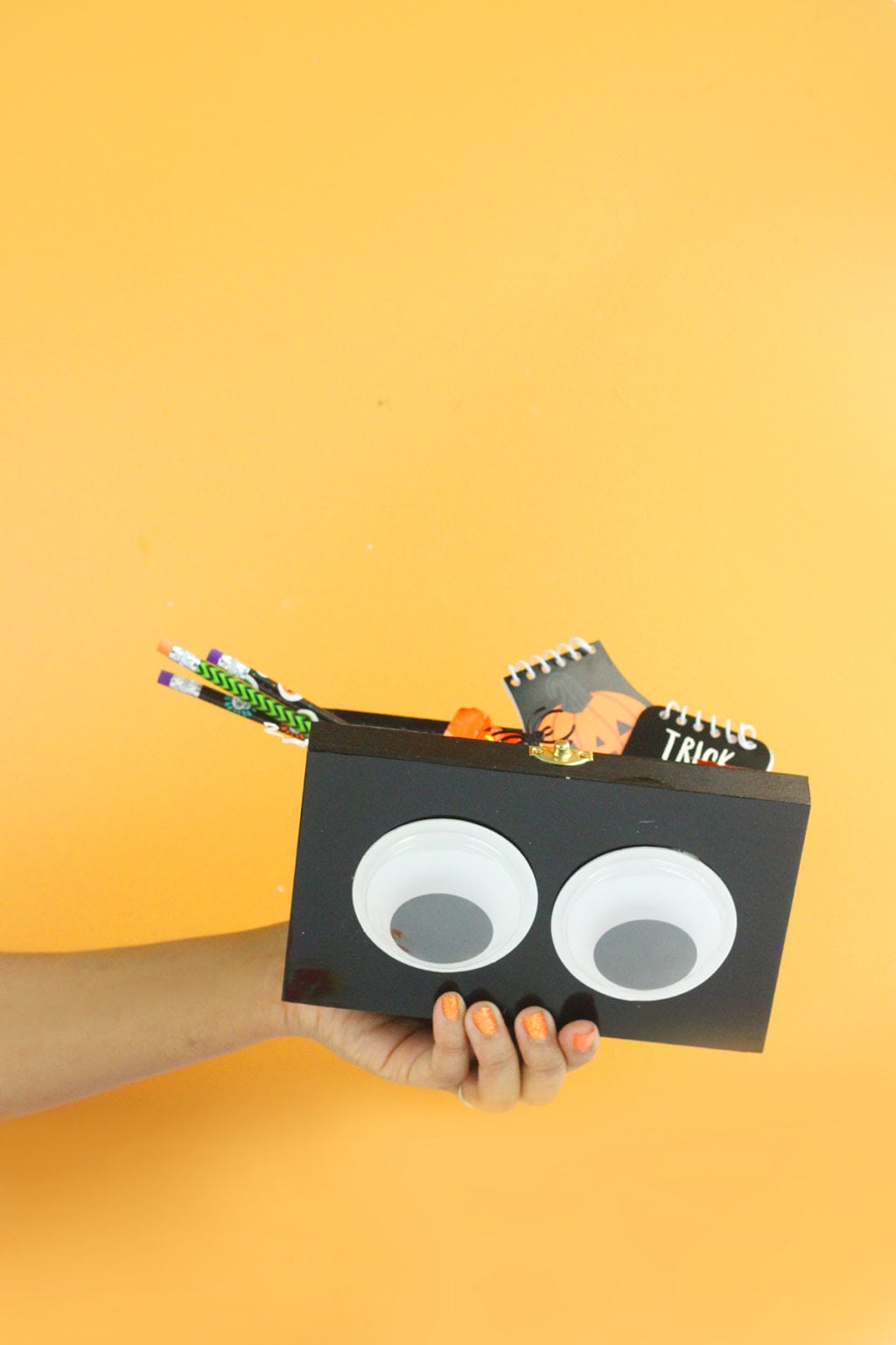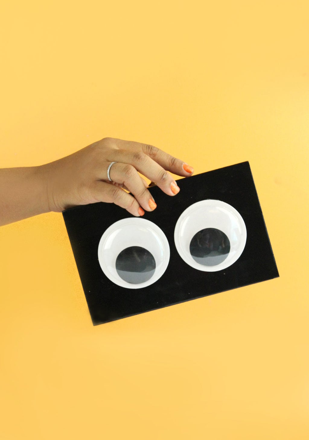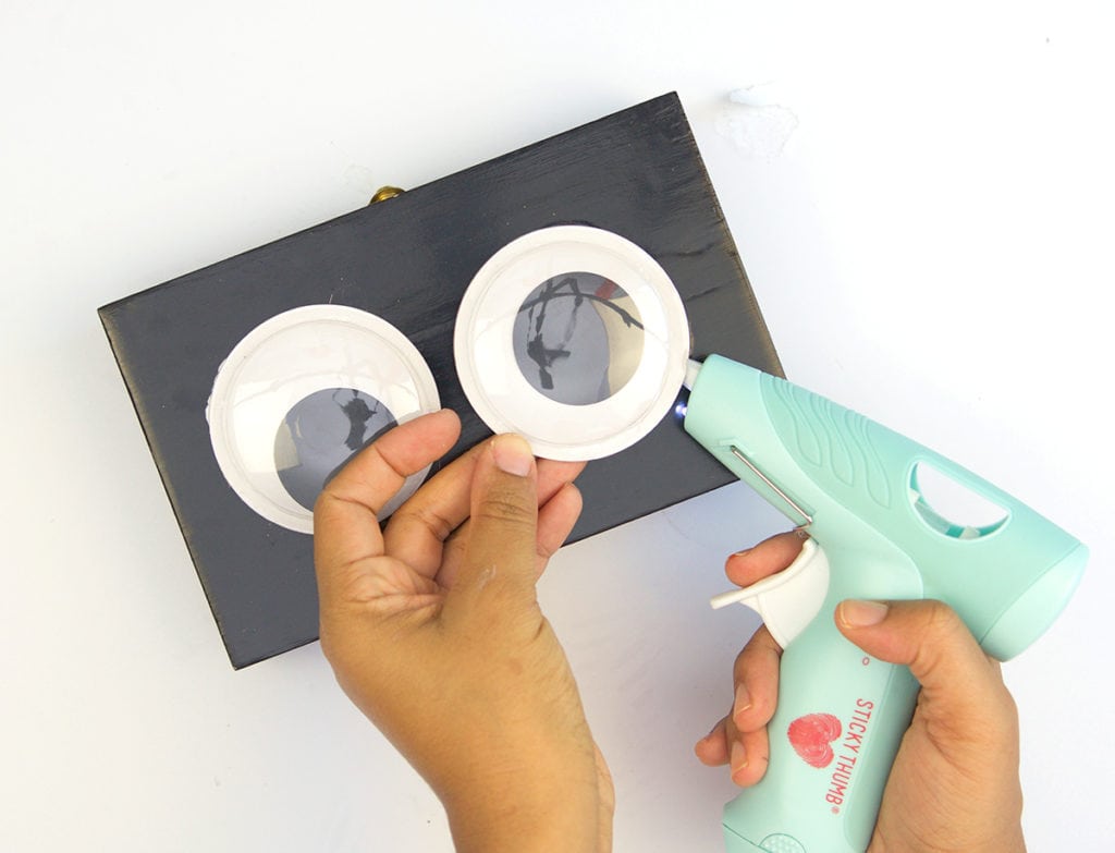 - Use the hot glue gun to attach the large google eyes