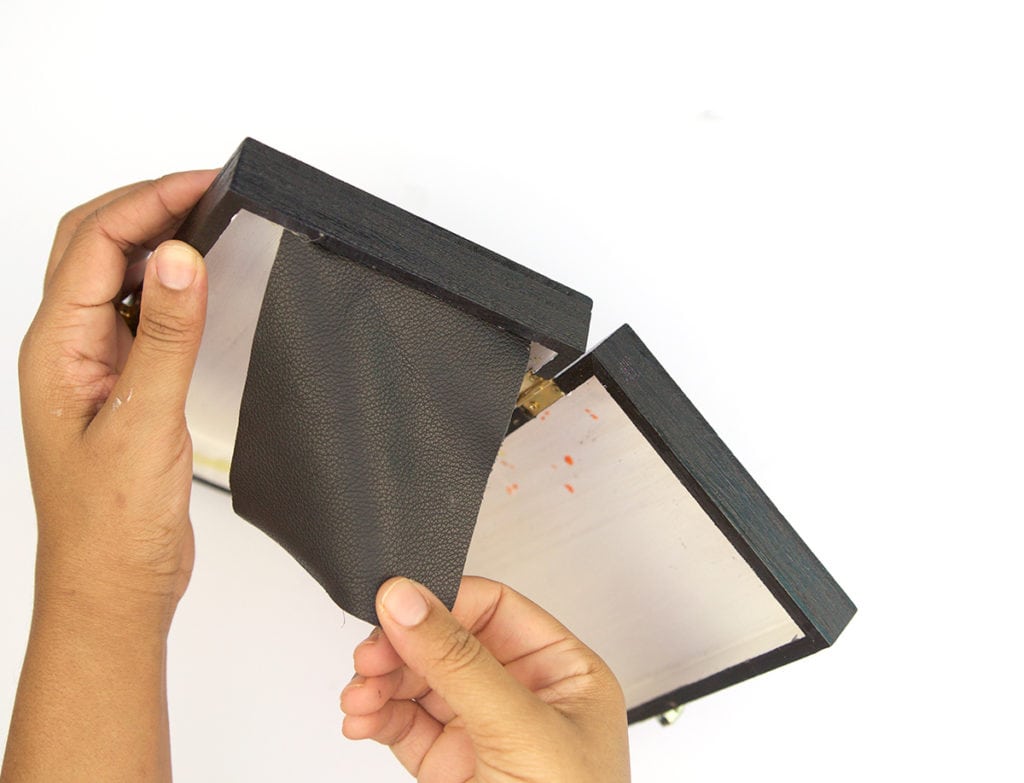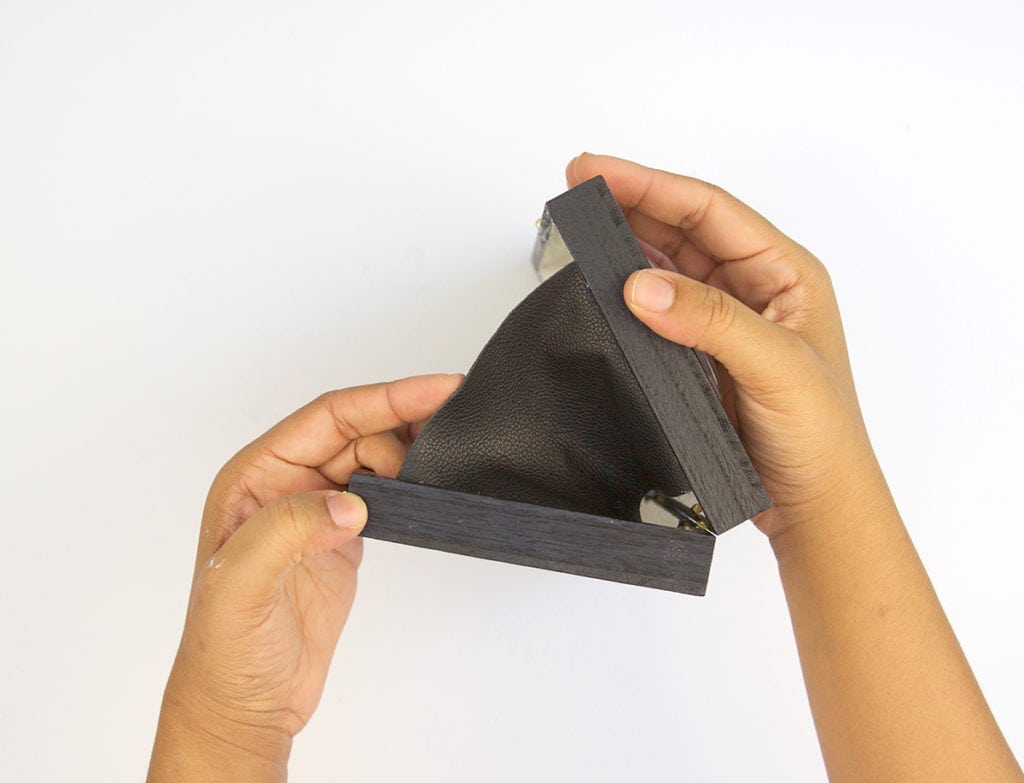 - …then add a line of hot glue to the opposite side of the clutch and adhere the leather. Do this on both ends of the box clutch