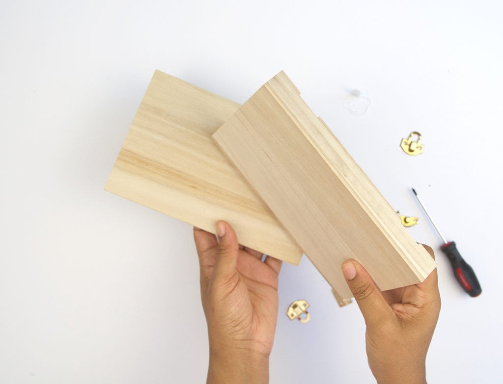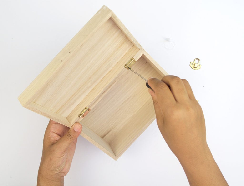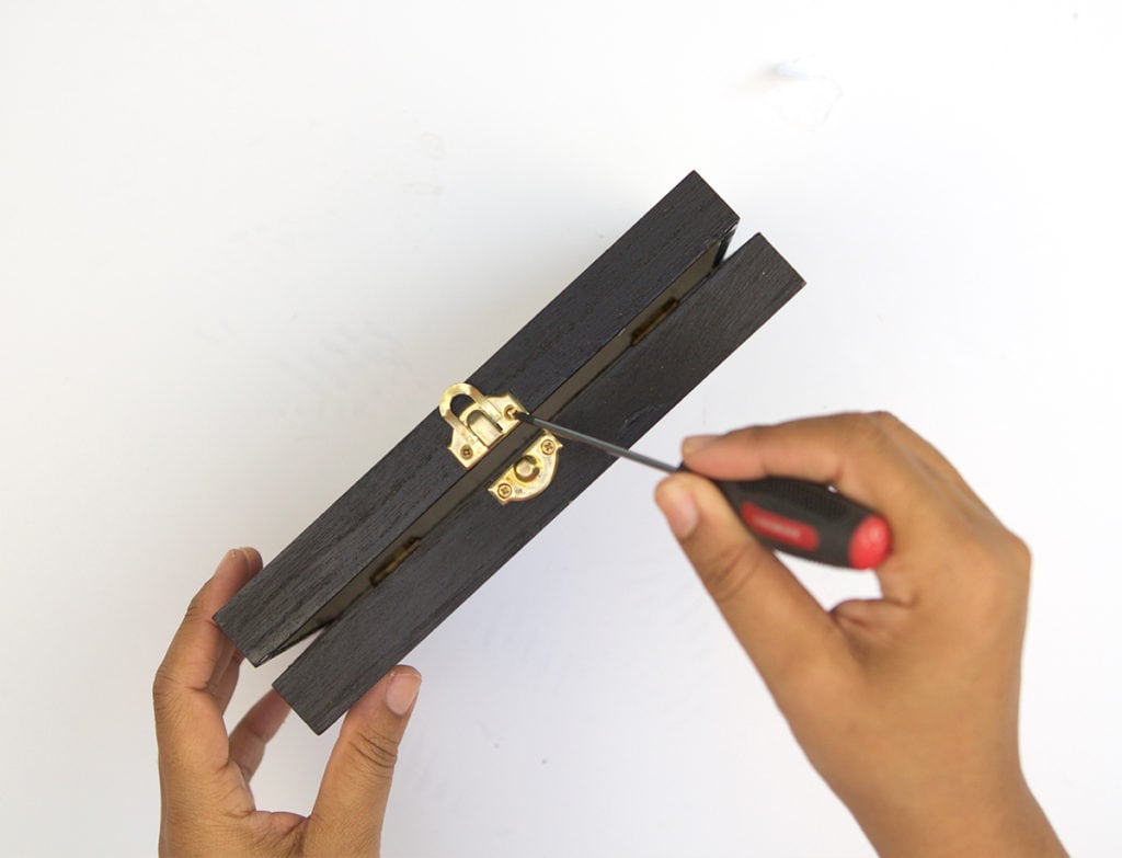 - Use the screwdriver to remove the clasp closure on the box as well as the hinges (do this for both wooden boxes).