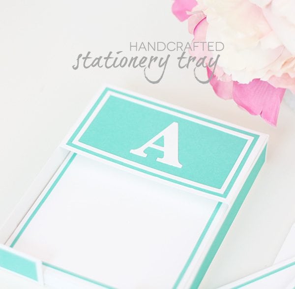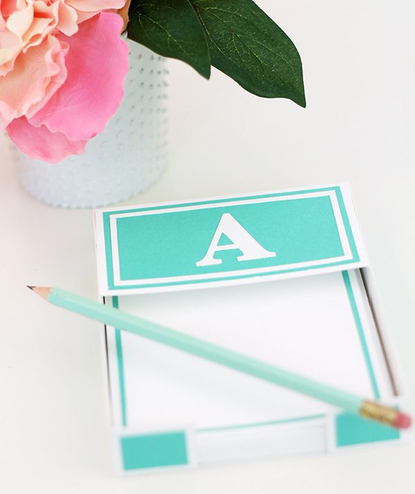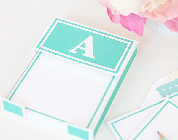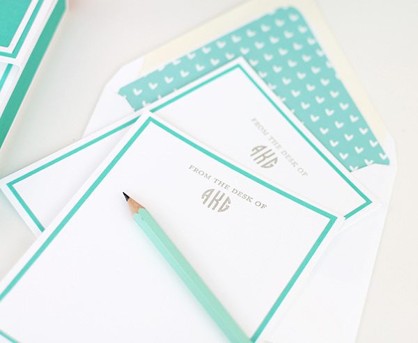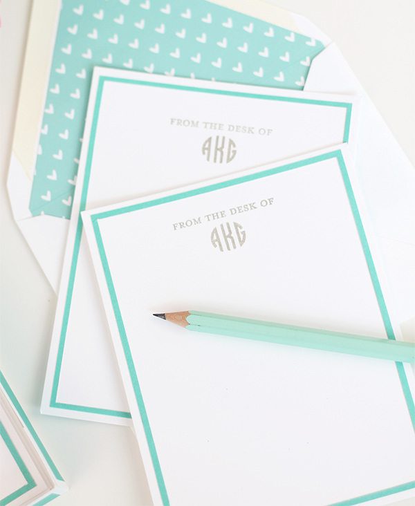 Inside the stationery tray you can tuck a few handstamped cards. For my notecards, I trimmed a coordinating frame with a craft knife, then stamped my monogram.