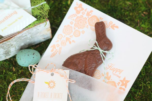 In each glassine envelope, I created a simple stamped flat card and tied a chocolate bunny to the front with baker’s twine.