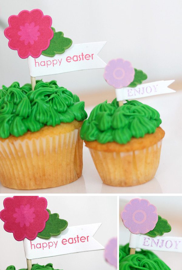 Of course, you could create these little baskets and fill them with traditional Easter candy. I, however, opted for the cupcake route. I added green frosting to the tops to mimic grass and added a banner flag topper along with a springtime-y flower. Almost too cute to eat, right? Almost. Those cupcakes definitely got ate up.
