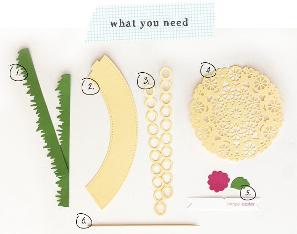 NOTE: To create a basket from the mini cupcake wrapper die, use the largest flower from Build-a-Flower die collection in place of the doily.