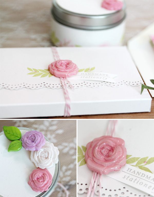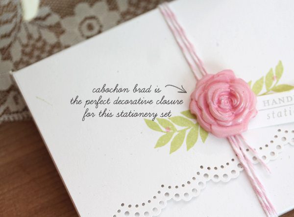 Now it’s time to show you how I used my handmade cabochons. Well, first I just sorta stared at them and admired how pretty they were in a pile together. Feel free to do the same. Once you’ve stopped ogling your creations, there are plenty of ways that you can use them to dress up even the simplest of projects – like this little stationery set I created.