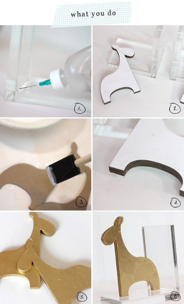 {6} Use a hot glue gun to adhere the giraffes to the acrylic bookends.
