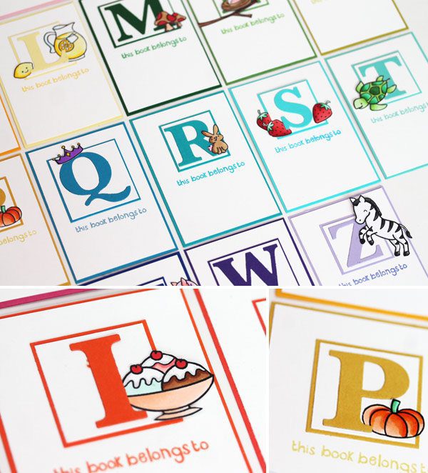 And because I think these are so cute, and because they are so easy to make – I challenged myself to create an entire alphabet of bookplates! Turns out that Lawn Fawn carries images that coordinate with almost every letter in the alphabet!