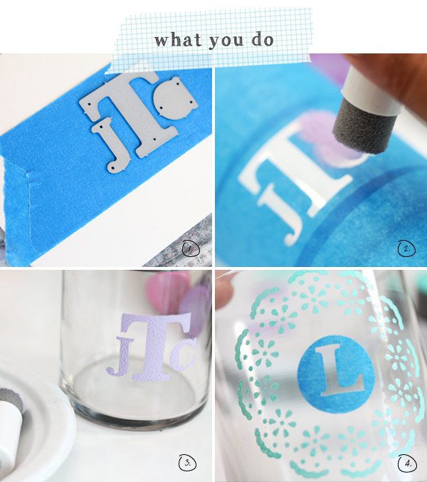 {2} Clean the glass jar surface with alcohol, then place your painter’s tape stencil onto the jar. Press all of the edges into the jar and use additional pieces of tape cover the rest of your stenciling surface. This will just ensure that you don’t accidentally get paint where you don’t want it. From there, simply use the dauber to apply the paint.