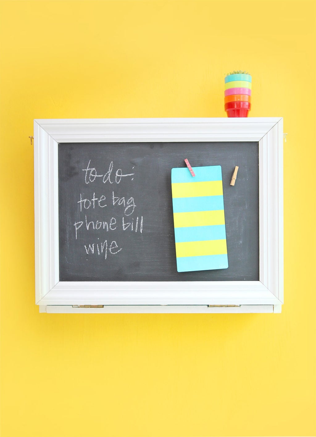 When closed, this mail station is just as functional. I painted the front door with magnet primer and chalkboard paint to create a magnetic chalkboard. I then framed the whole thing with molding. To cut the molding, I used this Ryobi Miter Saw, which was surprisingly easy to use.