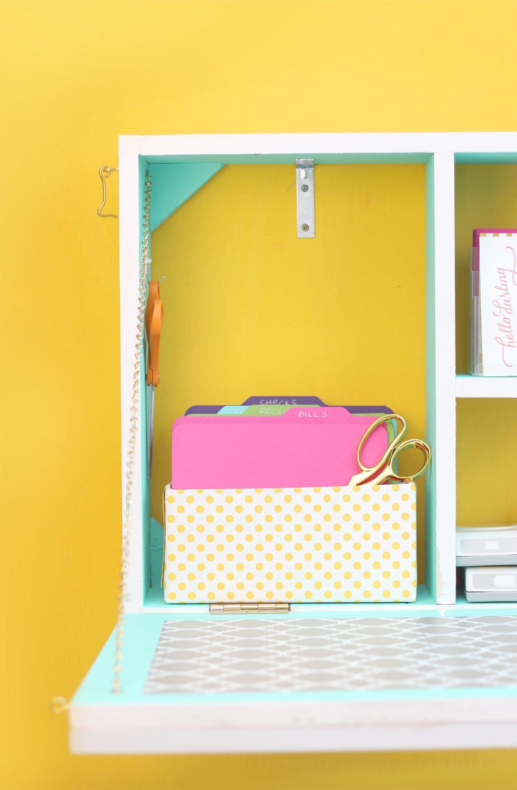 Unlike the original design, this mail station has a hefty dose of color. Yeah. Shocker, right? I painted the inside of the station with aqua paint and kept the rest clean and simple with bright white. To define a small workspace on inside of the door, I added a quatrefoil print drawer liner with self-adhesive backing.