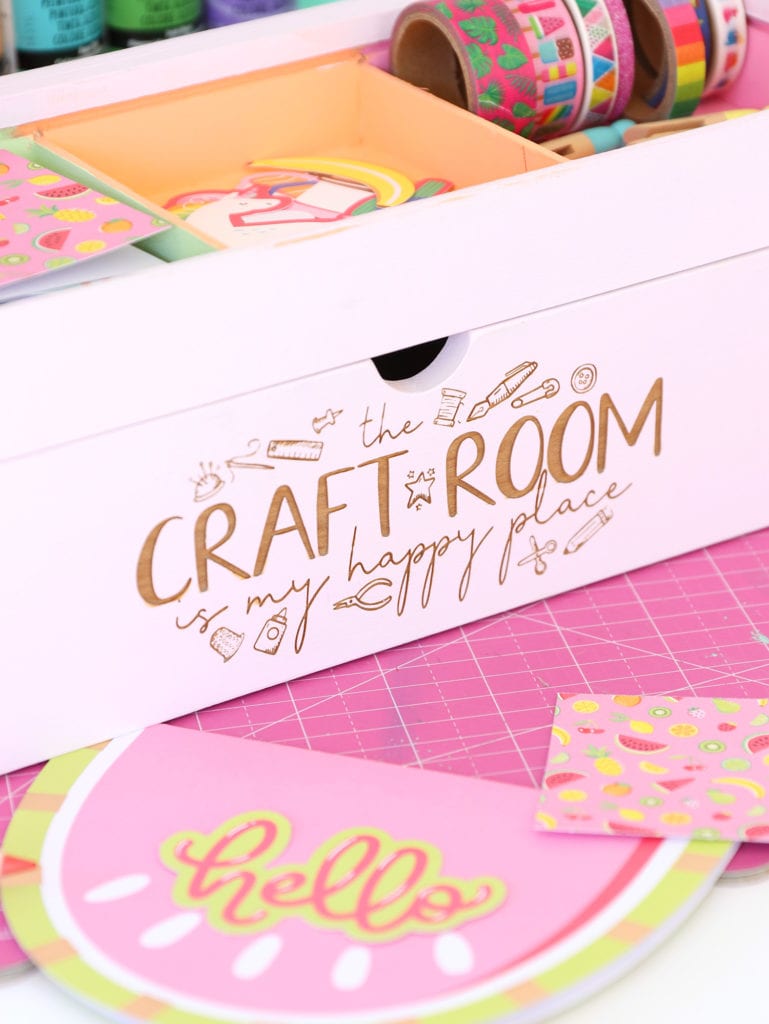 - To engrave this crate, you’ll want to keep the layout of your design in mind. Make sure you account for the two pieces that make up the front of the crate. You’ll want to engrave a little on the top and the rest of the design on the bottom piece.