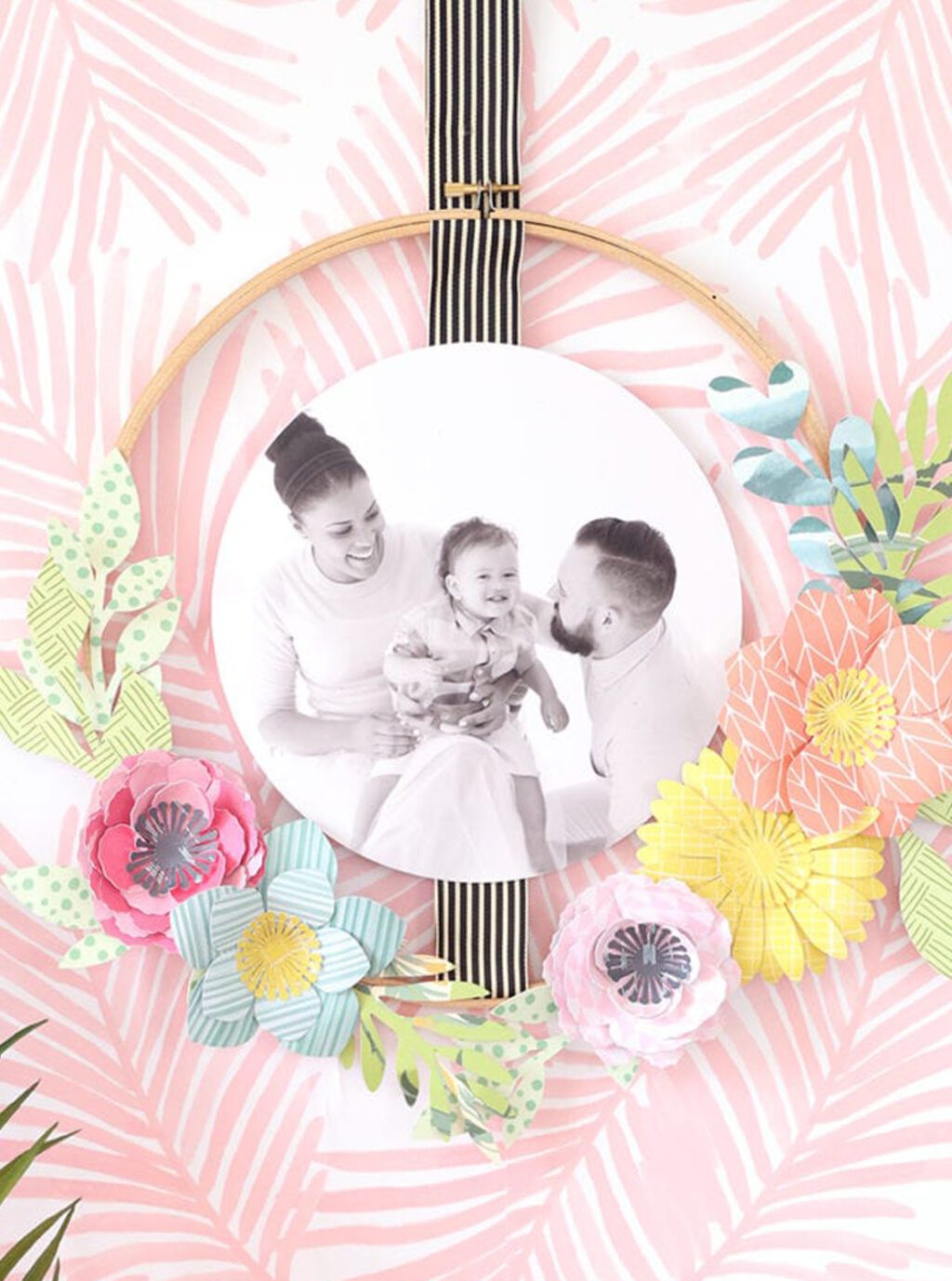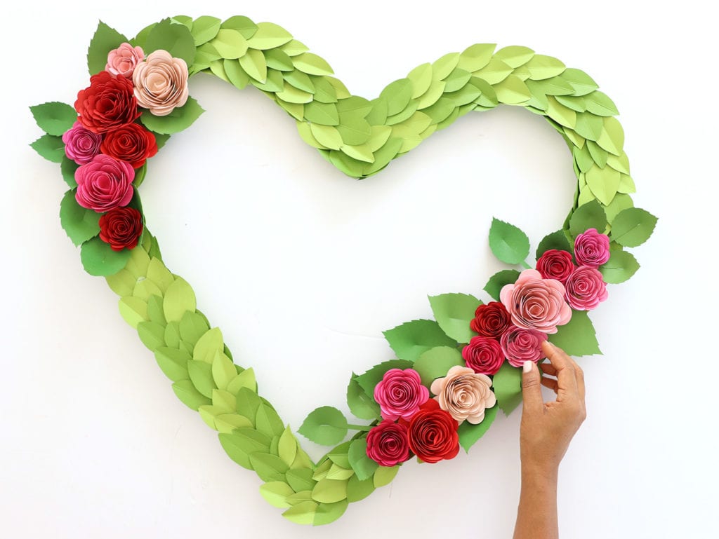 Once you’ve made your foam heart wreath form – it’s time to decorate!! This is the fun part. I cut out a bunch of leaf shapes from green cardstock and used my Cricut to create some paper flowers. You could also your faux flowers from the floral department of JOANN!